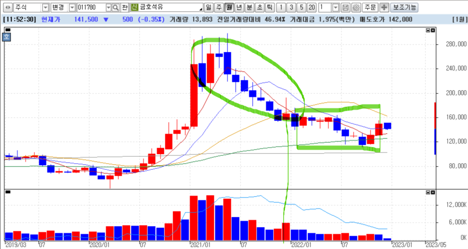 가장 드라마틱하게 볼수 있는 종목을 하나 뽑았는데 바로 금호석유 입니다.
