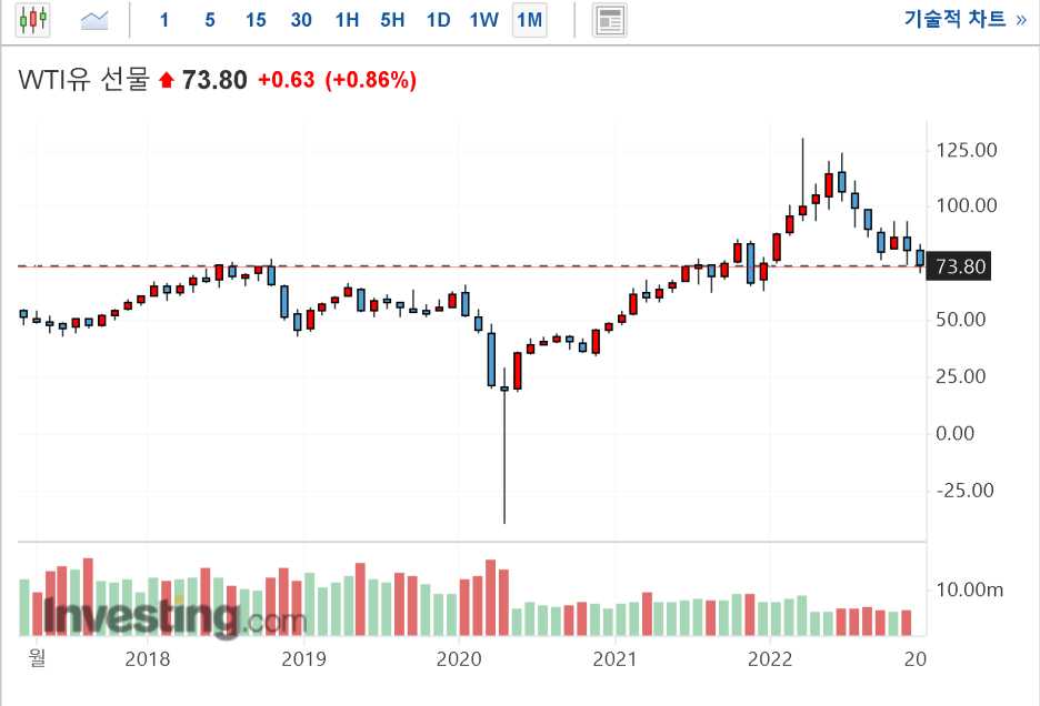 WTI 원유선물의 가격변화를 기준을 봤을때, 유가는 점차 안정화 되고 있습니다. 월봉기준으로 봤을때 차트상으로 73달라 부근에서 한동안 안정화 될거라고 예측할수 있을것 같은데요. 만약 내년 경기침체가 본격화 되면 50달라 수준까지 하락할 가능성이 있고, 러시아 우크라이나 사태가 좀더 확전된다면 100달라 까지 상승할수도 있다고 생각할순 있지만 최소한 73달라 부근에서 큰 변화가 일어나기엔 기술적으로 지지해 주는 위치라 요정도 선에서 물가가 안정화 될것이라고 생각할수 있을것 같습니다. 그렇다면, 우리가 오늘 CPI가 어떻게 나올지 정확하게는 알수 없지만, 크게 뭔가가 변할 가능성이 매우 낮을거라고 생각할 수 있겠죠.