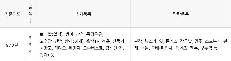 일단, 소비자 물가지수에 들어가는 물품의 선정기준이 해마다 다르고 시대마다 다르고 당연히 국가마다 다릅니다. 왜냐하면 우리나라 에서는 과거에는 연탄이 중요한 난방연료의 하나였지만, 지금은 그 비중이 매우 낮죠. 때라서 과거엔 CPI에 연탄가격이 지수에 포함되었지만 지금은 포함되지 않습니다. 이런식으로 각국가마다 필수품들이 각자 다르기 때문에 CPI 지수를 동일시 할필욘 없다는 겁니다. 그렇다면 과거 CPI 품목들중 어떤 물건들이 추가되고 빠지는지 비교해 봅시다.