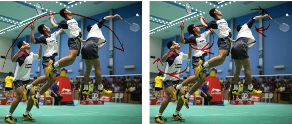 인간에게는 다양한 관절과 그 관절을 움직이게 하는 골격근들이 다양하고 복잡하게 엮여있기 때문에 우리는 별다른 생각 없는 단순한 동작도 하나하나 분석해서 구분해 보면 정말 다양한 서로 다른 운동의 복합체입니다. 우리는 배드민턴 얘기를 하는 거니 우리 대표 사진을 통해 배드민턴을 배우지 않은 사람들이 생각하는 운동의 힘의 방향과 배드민턴을 배운 사람의 힘의 방향이 어떻게 다른지 생각해 봅시다.