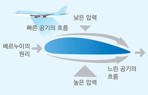 이 원리는 비행기 날개에도 적용되는데, 비행기가 달리면 날개의 형상때문에 상부가 하부보다 유속이 빠르므로 압력은 하부가 높아집니다. 따라서 이 힘므로 비행기가 뜹니다. 이와 마찬가지로 삼각돛도 진행 방향으로 돛을 부풀리면 비행기 날개와 같이 유속차가 생겨 배 의 진행방향으로 압력이 작용합니다. 이 힘으로 배는 역풍에도 전진하게 됩니다.