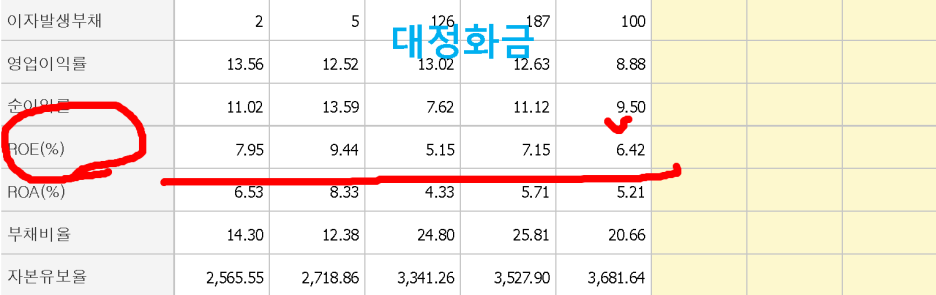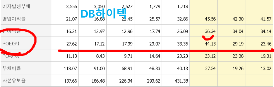 자세한 이해는 알아서 하시고^^ 우리는 실전으로 바로 들어갑시다. 위에 참고 자료를 보면 DB 하이텍은 자기 돈을 가지고 어마어마하게 돈을 벌어드리고 있다는 것을 알 수 있습니다. 특히 표시된 곳은 44프로까지 올라갑니다. 쉽게 얘기하면 여러분이 천만 원 가지고 주식을 하면 일 년에 수익을 440만 원을 벌었다는 뜻입니다. 그에 비하면 대정화금은 돈을 가지고 제대로 돈을 벌지 못했다는 뜻일 겁니다.