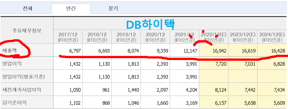 그렇다면 실전 투자자의 입장에서 알아야 할 부분은 매출의 추이를 보는 게 맞습니다. 위의 그림은 오늘도 소환된 카카오게임즈와 DB 하이텍입니다. 저 매출액을 보면 웬만한 주식은 다 꼬꼬마 구멍가게처럼 만들어 버리는 매출 단위입니다. 하지만 투자자로서 저 단위가 중요한 게 절대 아닙니다. 물론 무시하라고 하는 것은 아니지만 실제는 매출이 매년 혹은 분기 단위로 어떻게 늘어나고 있느냐가 훨씬 더 중요합니다.