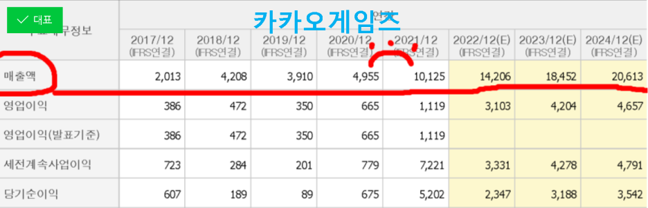 그렇다면 두 주식을 비교해 보고 어떤 기업이 더 투자하기 좋은 기업일까를 딱 매출액만 보고 생각해 봅니다. 다른 것은 고려하지 말고. 그렇다면 당연히 카카오게임즈이죠. 왜 그런지는 구태여 설명해 주지 않아도 알겠죠?