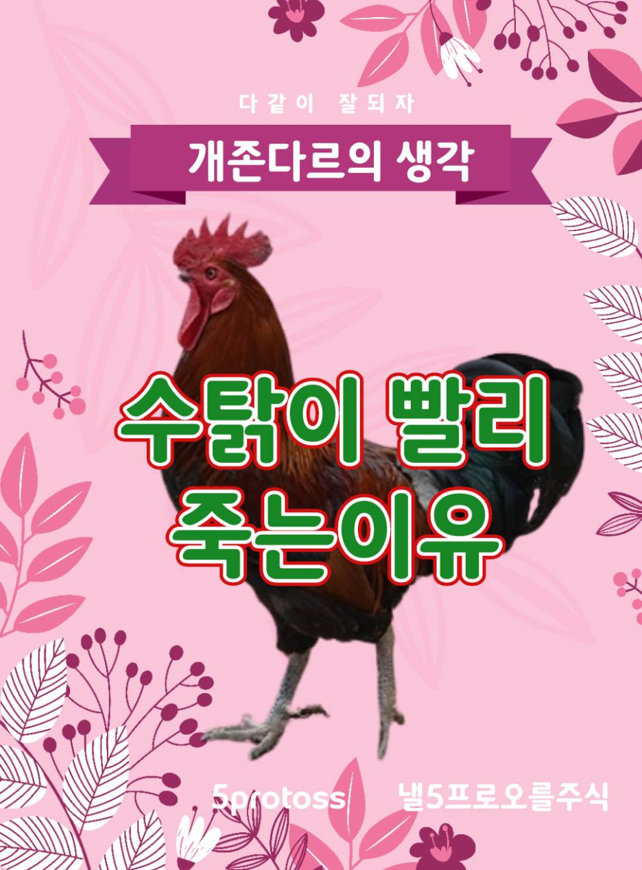 결국 장닭이 되지 못한 수컷들은 어떻게 해서든지 본능을 해결하기 위해 나 이외의 모든 수컷들과 경쟁하고 싸우게 되잖아요. 물론 다행이 모든 수컷을 이기고 내가 독차지 하면 좋겠지만 그게 맘대로 되나요? 그러다가 나도 다치고, 암탉도 다치고 알도 못낳고 여러가지로 고난이 열리는 거죠.