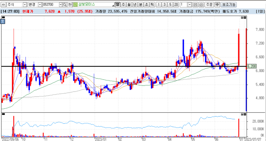 정말 오래간만에 보는 삼보모터스네요. 참 좋은 회사라고 생각하는데요. 오늘 많은 사람들이 주목할만한 흐름이 나왔군요. 6200원이 아주 중요한 저항라인이었는데 시가부터 강하게 뿜었다고 봐야겠네요. 더구나 오늘 장초반에 우리장 그리 좋지 못했는데 그런 분위기를 감안했을때 더더욱 좋은것 같아요.