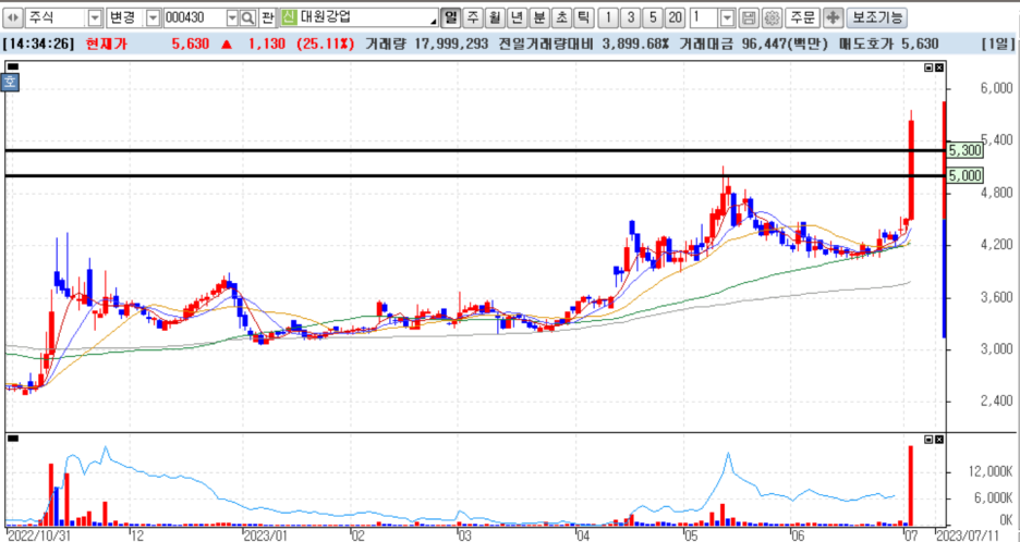 굉장히 강력한 매물대인 5000원 5300원 라인을 강하게 돌파해 버리는 흐름이 나왔는데요. 일봉으로 보니 좀 감흥이 안오는 투자자도 있겠지만, 분봉으로 오늘의 흐름을 보면 대단하다는 생각이 듭니다. 회사명을 보니 아무래도 철강을 가지고 가공하는 사업같다는 생각이 드는데요. 대부분 이런 회사들이 이렇게 움직일땐 분명 이유가 있을 거라고 봅니다. 철강이라는 것이 이름처럼 참 움직임이 무겁거든요.