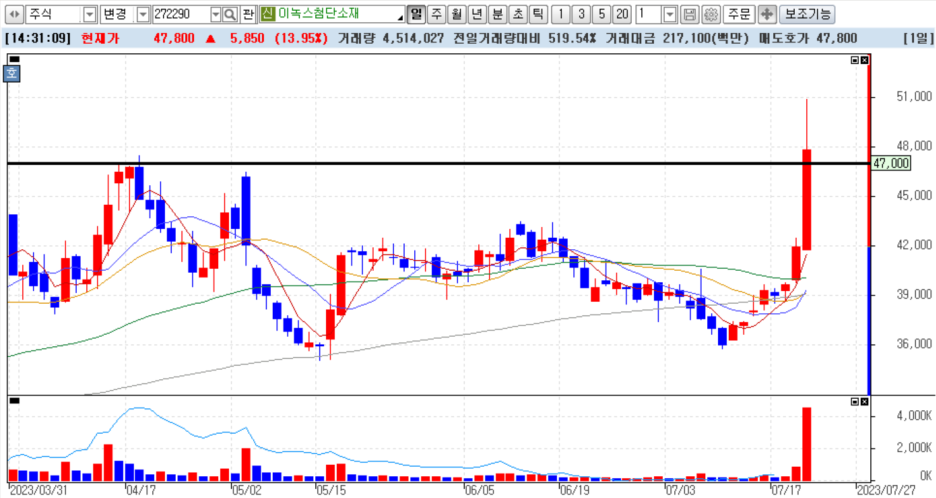 오늘 딱히 상승이유는 없는 데요. 관련뉴스조차 뜨지 않네요. 다만 몇달전에 이녹스첨단소재가 2차 전지용 수산화리튬 사업을 하겠다고 밝힌적이 있는데, 관련해서 세력들이 한번 들어 올릴때가 되었다고 생각했을련지 모르겠네요. 다만 지금까지 이 공시후 특별한 공식적인 움직임이 찾을순 없구요.