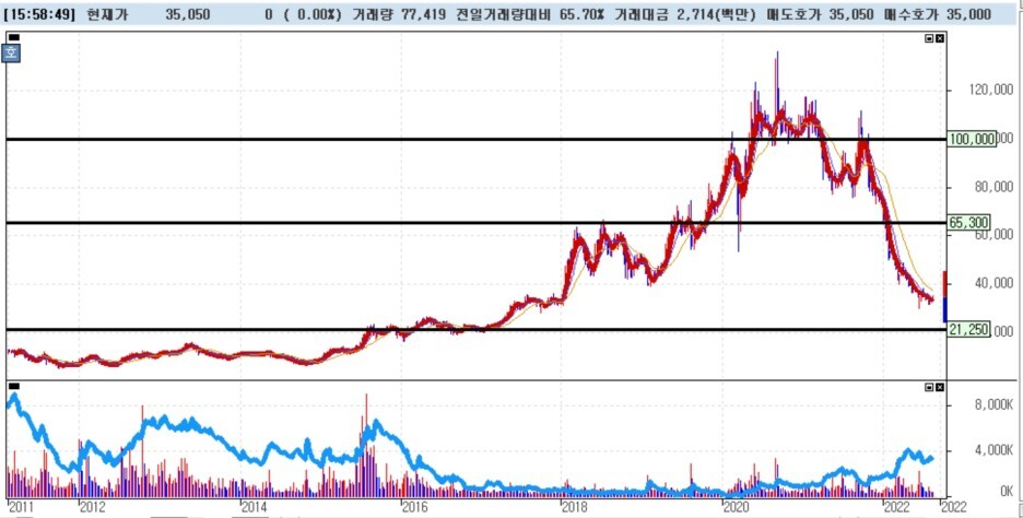 일단 우리 좀 큰 그림부터 보죠. 주봉 10년짜리 차트입니다. 이게 바로 텐 버거 10배 수익 차트입니다. 잘 보시면 알겠지만 10배가 오르기 전에 5년 이상을 바닥에 껌처럼 붙어 있습니다. 이게 바로 우리가 버텨야 될 시간입니다.