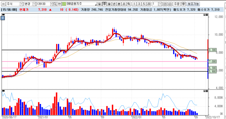 1. 주봉만 봅시다. 지금 거래량 없이 그냥 흐르는 차트라 일봉을 볼 필요가 없습니다. 보수적으로 생각해서 작년 배당이 630원이었는데 최소한 올해 그 정도만 준다고 가정해 볼 때 배당 9프로 라인이 7000원입니다. 그리고 10프로 라인은 6300원입니다. 더불어 은행섹터 전반적으로 배당성향이 증가하는 추세라 아마도 올해 배당이 630원 보다 증가할 가능성이 매우 큽니다. 그렇다면 7000원 이하로 하락하면 6300원까지, 그냥 버티기 심심하니 조금씩 매수해서 비중 100프로 만들기 바랍니다. 이런 자리에서 구태여 리밸런싱 할 필요도 없다고 봅니다.