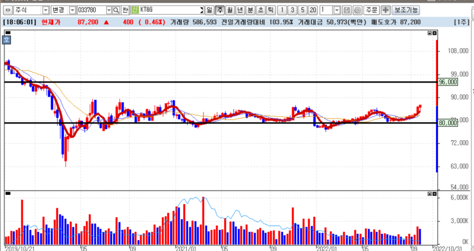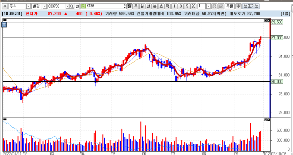 일단 80000원의 가격대를 음미해 보면 배당 4800원을 준다고 가정할 시 6프로 배당 수익을 기대할 수 있는 가격대입니다. 더불어 96000원은 5프로 배당 수익을 기대할 수 있는 가격대이고요. 며칠 뒤면 벌써 10월인데 4분기가 되면 싫으나 좋으나 배당주들이 관심을 받게 마련이죠. 그렇다면 이렇게 차트가 살아있고 배당까지 고배당이 확실시되는데 KT&G가 절대 투자자들의 관심 밖을 벗어 날 리가 없겠죠.