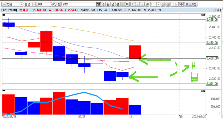 2022.9.13일 오후 12시 37분의 코스피 차트의 일봉입니다. 대부분의 일반적인 상황에서의 차트는 어제의 종가가 오늘의 시가가 되는 경우가 많습니다. 설사 일치하지 않더라도 한두 호가 차이 나는 게 거의 대부분일 텐데 장이 열리지 않은 시간 동안 시장이 어제 종가에 미쳐 반영하지 못한 이슈가 일어나면 시장은 다음날 아침 시가에 이 이슈를 반영하려고 가격을 조정합니다. 이때 호재로 상승하면서 높은 가격에서 시작하는 것을 갭상승이라고 하며 반대로 악재를 반영하면서 낮은 가격에서 시작하는 것을 갭하락이라고 합니다.