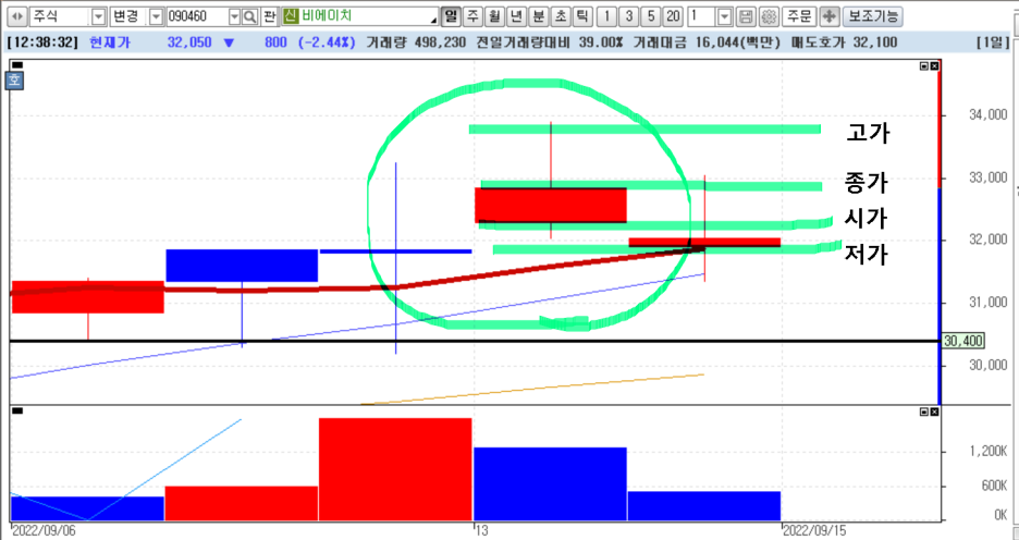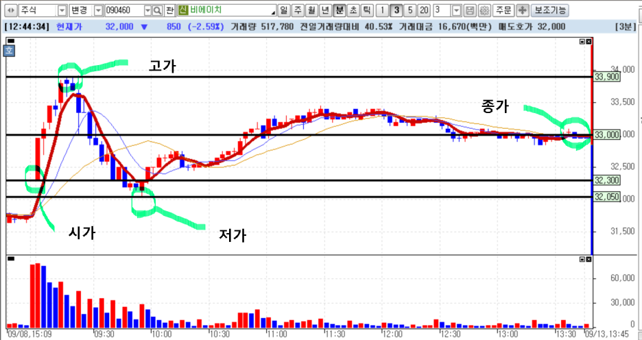 이제 실제 차트에서는 어떻게 표현되는지 일봉과 분봉을 보면서 알아 봅시다. 녹색형광펜 부분을 봅시다.