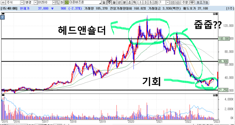 더존비즈온 주봉차트를 봅시다. 사실 저렇게 상승한 주식에서 헤드앤 숄더 패턴이 나타나면 사실 끝났다고 봐야하지만, 기업을 분석해 해보면 절대 아직 끝나지 않았죠. 시간이 걸리겠지만 언젠가는 다시 고점을 도전할거라고 봅니다. 하지만 작가도 말하고 있듯이 심리와 수급이 무너졌기 때문에 견뎌야 하는거죠. 하지만 보시죠. 투자자들이 줍줍으로 표시된 부분에서 아마도 많이 매수했을 거라고 봅니다. 하지만 저라인은 심리가 무너지는 차트이기 때문에 절대로 매수하면 안되는 떨어지는 칼날입니다.