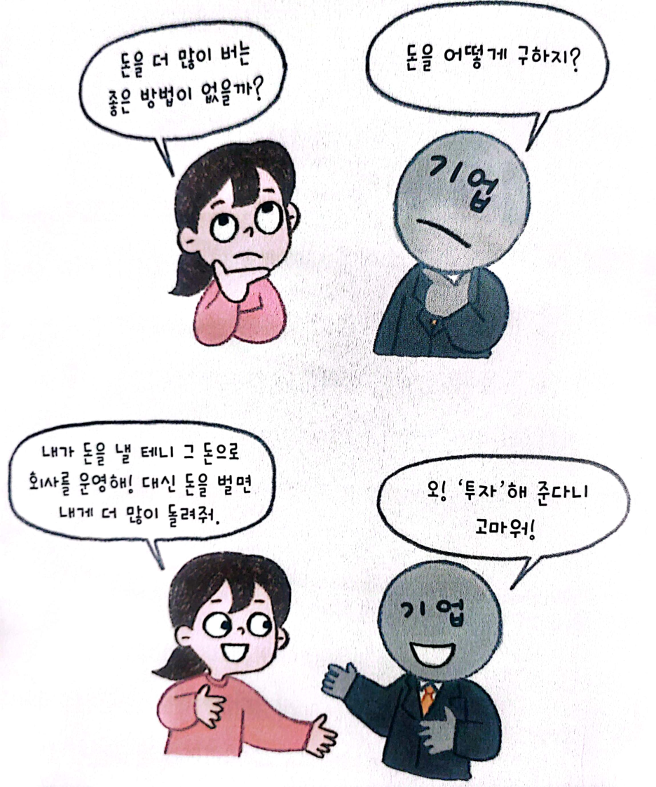 하지만 이 돈을 은행에서 빌리거나 정부에 지원받는 것만으로는모두 마련할 수 없어. 기업은 더 많은 자본을 마련할 방법이 없을까고민했지. 그래서 기업을 잘 꾸려서 훗날 이익이 생기면 그 이익을나누어 주겠다는 조건으로, 돈을 얻는 방법을 궁리하게 된 거야. 즉'투자를 받기 위한 방법'을 생각한 거지.