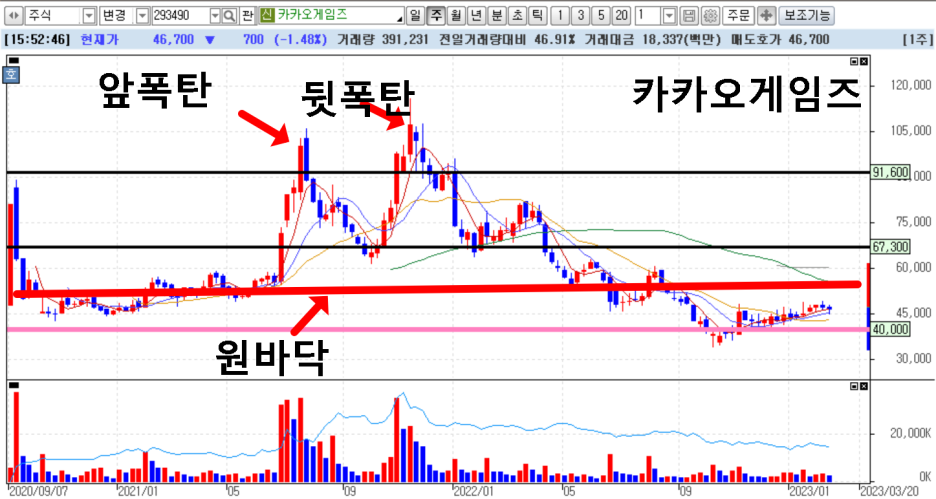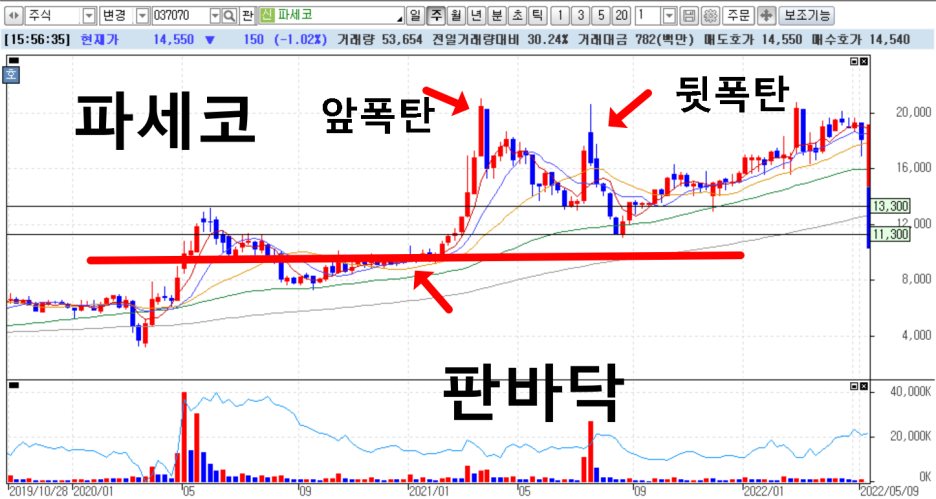 하지만, 세력들은 뒷폭탄 부근 거래량, 또는 투자자들의 심리를 이용해서 물량을 정리하고 탈출하죠. 그리고 급락시키는 경우가 많죠. 그래서 작가는 뒷폭탄이 터지는 자리도 절대 사면 안되는 종목이라고 강조하고 있습니다.