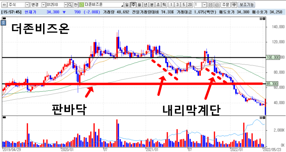더존비즈온인데요. 판바닥을 만든후 목표가에서 크게 밀리지 않고 있다가 거래량을 실으면서 양봉을 만들어 준후 더이상 상승하지 못하고 흐르듯 하락하는 신호가 보이는데요. 이런것을 작가는 내리막계단이라고 설명합니다. 이런 신호가 보이면 절대 진입하면 안된다는 것이죠.