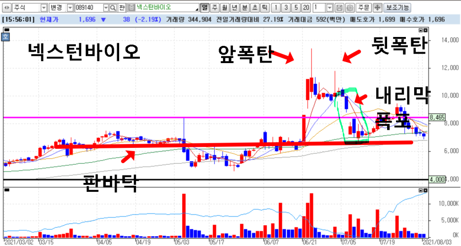 작가가 내리막폭포에 대해서 설명하고 있는데, 이런 현상을 우리 상담종목에서는 넥스턴바이오에서 볼수 있는데요. 작가는 이런 내리막폭포 현상이 나타나면, 절대 진입금지라고 말하고 있는데요. 그런데 많은 투자자들이 그렇지 않죠. 오히려 매수 기회다 하며 더 달려 드는데요. 안타까울 따름입니다.