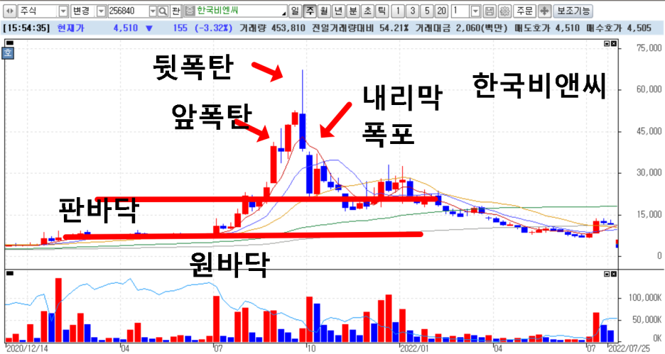 만약에 한국비엔씨가 정상적인 파동을 만들면서 괜찮은 주식이 됐으려면, 판바닥쯤에서 마무리 했어야 하는데, 판바닥에서 과열된 슈팅을 하면서 앞폭탄이 터지는데, 여기서 한번더 받아서 뒷폭탄이 더 크게 터져버립니다. 만약에 이것을 받아 내려면 회사에 그럴만한 이유가 분명이 있어야 하는데 아쉽게도 그렇지 못한거죠. 때문에 어마어마한 매물 폭탄이 터지면서 내리막 폭포가 일어 납니다.