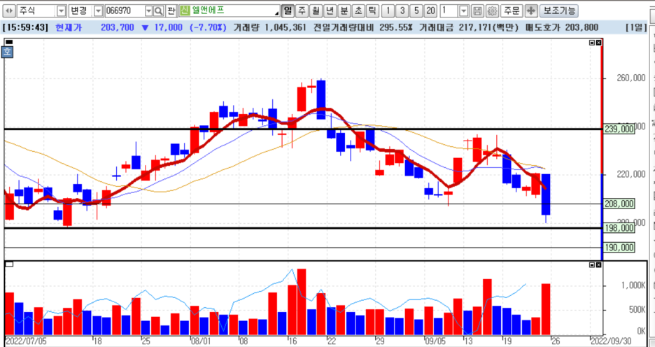 일반적으로 사람들이 주로 사용하는 방법 중 하나가 시가 기준 3프로 하락 혹은 5프로 하락을 주요 손절라인으로 사용합니다. 어떤 사람들은 본인이 매수한 가격에서 3프로 5프로 하락 기준을 삼기도 하지만 솔직히 그렇게 하는 것은 근거가 뭔지 묻고 싶지만... 우주의 모든 이치가 본인을 기준으로 흘러간다고 생각하는 사람도 있으니 논외로 하죠.^^ 하지만 시가 기준으로 정한다면 나름 의미가 있습니다. 그렇다고 옳다는 것은 아니지만, 일단 차트를 보죠. 얼마 전에 단기 매매로 상담한 엘앤에프입니다.