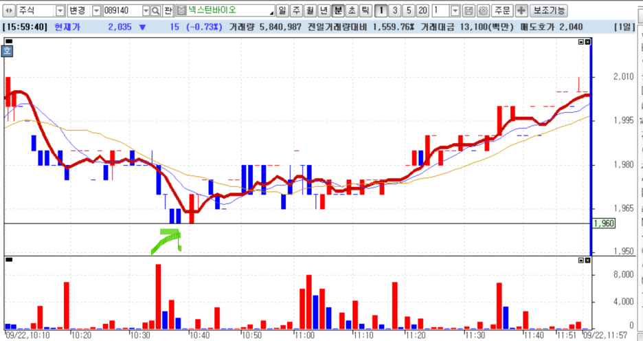 2022년 9월 23일 급등이 나왔습니다. 하지만 분봉을 보면 세력들이 참 못됐다고 생각될 정도로 어이없긴 한데 우리는 그것보다는 3프로 5프로 구간에서 사람들의 심리가 어떤지를 봅시다. 일단 3프로 구간은 1960원이고 5프로 구간은 1915입니다. 그걸 참고로 분봉 살펴봅시다.