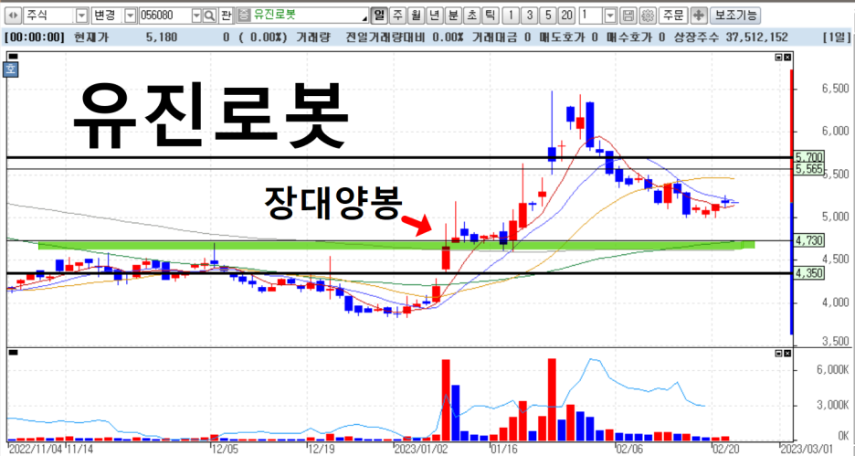 유진로봇의 최근차트 인데요. 모든게 원리는 비슷합니다. 저점에서 장기간 횡보후 전고점을 돌파하는 장대양봉이 나타나고 있습니다. 물론 장마감까지 유지하지 못하고 윗꼬리를 만들었지만, 장중엔 정말 멋진 장대양봉을 유지했을거라고 봅니다. 그렇다면 워낙 큰 하락과 횡보를 했으니 투자자들의 상실감과 불안은 상당했을거라고 볼때 저런 윗꼬리는 우리가 충분히 이해할만 하죠. 때문에 저런 윗꼬리를 단 장대양봉도 작가는 매수할 타이밍이라고 말하고 있습니다.