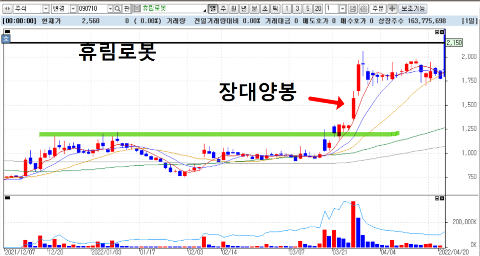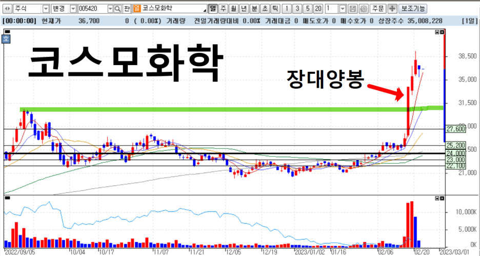 제목부터가 정신이 확들게 하군요. 작가역시 이런 차트가 나오면 매수할 준비를 한다는 거잖아요. 그렇다면 우리도 따라사지는 못할망정 소위 주식시장에서 고수들이 이런 차트에 관심을 가지구나를 알고 같이 관심을 가져볼 필요는 충분하다고 봅니다. 이번챕터에서는 그중에 하나인 저점장대양봉에 대해서 생각해 봐요.