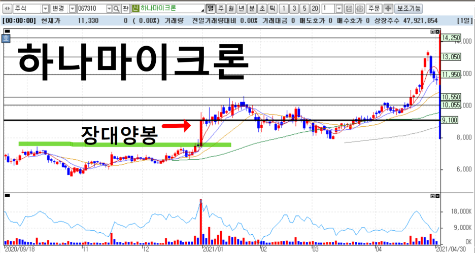 하여튼, 하나마이크론을 예로 들자면 저점에서 횡보하며 큰 움직임을 보이지 않을때 갑자기 전고점을 돌파하는 장대양봉이 출현 합니다. 또한 52주 신고가도 나타납니다. 물론 그 당시의 분위기로 볼때는 엄청난 고점처럼 보일수도 있지만, 길게보면 저런 자리의 장대양봉은 시세의 시작이라는 뜻입니다.
