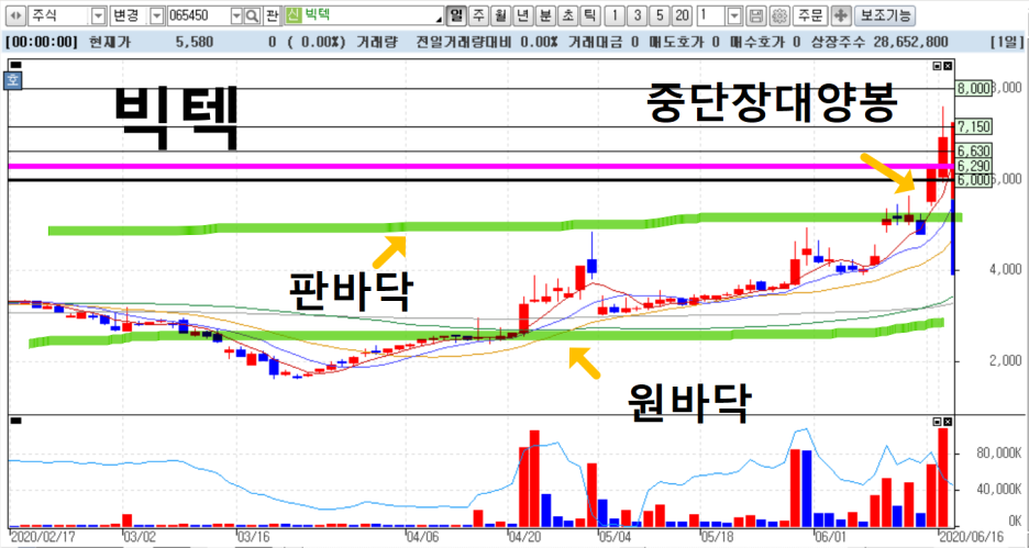 주식이 저점을 원바닥을 지지받고 상승하면, 판바닥을 형성하게 되고 판바닥을 만들면서 주식이 안정권에 접어 들게 되는데, 그때 또다시 고점을 돌파하며 장대양봉을 만드는 흐름이 나올때가 있는데 이런 파동을 작가는 중점장대양봉이라고 말하고 있습니다.