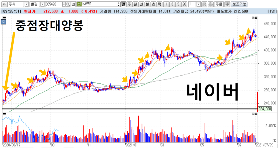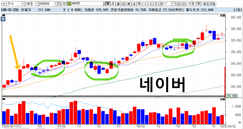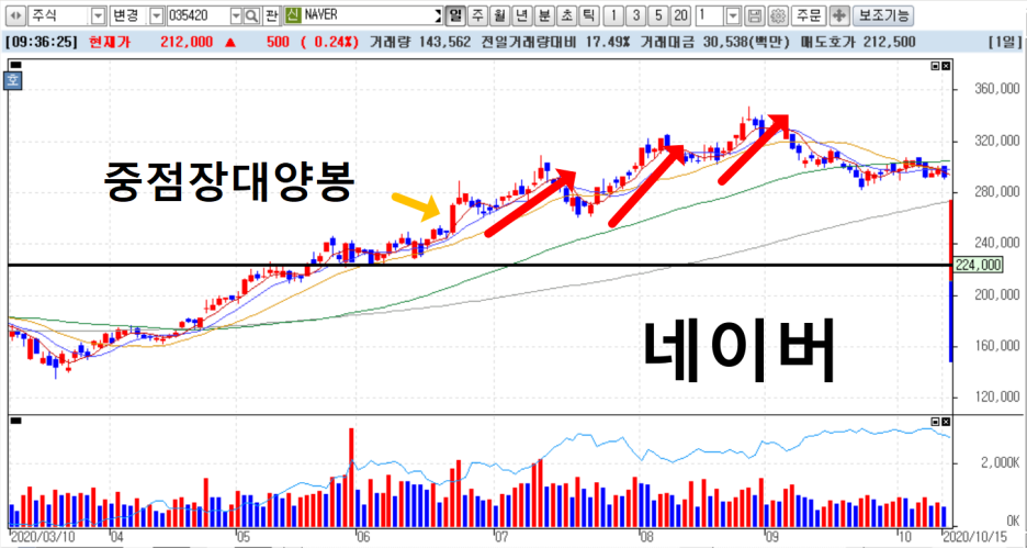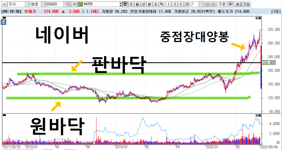 우리의 애증의 종목 네이버를 봅시다. 네이버가 급등하기 전에 흐름을 보면, 원바닥 판바닥을 거치며,자리를 잡아 주고 있습니다. 워낙 대형주다보니 아무래도 판바닥을 돌파하는 그림에도 제대로된 장대양봉이 서질 않는군요. 하지만 결국은 장대양봉을 만들면서 차트가 어떤식으로 변해 가는지 봐요.