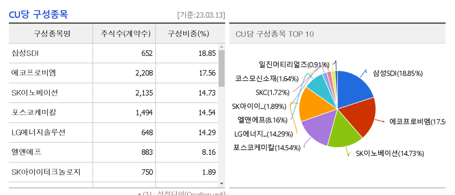 보면 CU당 구성종목이라고 나왔는데 그게 바로 PDF 입니다. CU는 Creation Unit의 약자인데 ETF 설정과 신주발행에 필요한 최소 수량정도로 이해하면 됩니다.