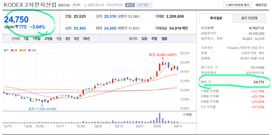 네이버에서 ETF 종목명을 검색하면 일반적인 종목처럼 동일하게 검색이 되는데요, NAV 값이 24,771원 실제 ETF 거래가격이 24,750원 이기 때문에 근소하지만 ETF 가격이 NAV값보다 저평가 되었네요. 아무래도 이 글을 쓰는 시점이 우리시장에 큰 하락이 나왔기 때문에 투자자들이 실제가치 이하로 ETF를 시장가로 던져버렸다고 봐야겠죠.