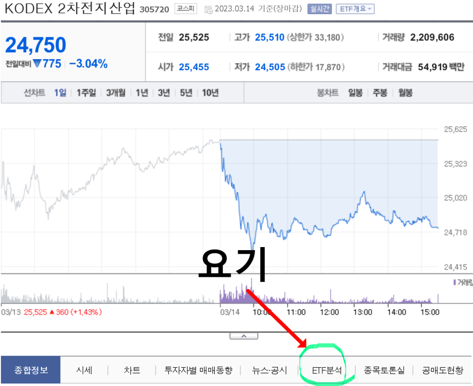 이거 점점 용어때문에 왠지 포기하고 싶어 질지도 모르겠지만, 사실 별거 아닙니다. PDF란 납입자산구성내역( Portfolio Deposit File)의 약자인데요. 쉽게 얘기해서 ETF가 어떤 종목으로 만들어 졌냐를 말하는 겁니다. 예를 들어서 내가 KODEX 2차전지산업 ETF를 매수하려고 했다면 해당 ETF가 어떤 구성종목이 포함되어있는지 알아야 한다는 거죠. 한번 실제로 찾아봐요. 네이버 증권에서 종목을 찾아보면, ETF는 일반적인 주식과는 달리 ETF분석이라고 탭이 있죠 거기에 들어가 보면 PDF를 볼수 있습니다.