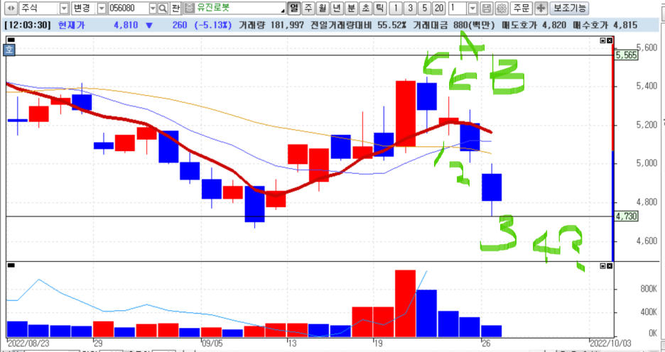 유진로봇입니다. 마찬가지로 오늘 주가지수의 하락으로 9월 26일 갭하락했다고 볼 수 있지만 역시 더불어 미수 반대매매도 한몫했다고 봅니다. A 지점 하루 전날 거래량을 실은 장대양봉이 떴습니다. 사람들의 마음에는 아마 희망과 탐욕이 싹텄을 거라고 봅니다. 때문에 실제로 오전 중에 고점도 잠깐이지만 돌파했고 충분한 거래량과 함께 5일선 반등도 했으니 사람들의 마음엔 충분히 배팅해 볼 자리였다고 봅니다. 예상치 못하게 이런 하락이 나오니 3일째 되는 날 오전 반대매매 미수와 함께 B 지점에서 산 미수 물량도 미리 겁먹어서 던져버린 결과지 않나 추측해 봅니다.