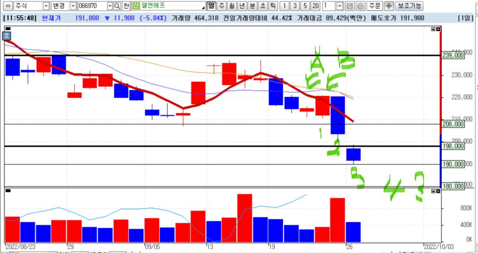 엘앤에프입니다. 물론 주가지수가 크게 하락했기 때문에 9월 26일 날 갭하락했을 수도 있겠지만 더불어 미수 반대매매의 영향도 분명 있었을 거라 봅니다. 일단 A 지점을 보면 쌍바닥을 만들 것 같은 위치이긴 한데 좀 불안하지만 뭔가 마음이 급하거나 크게 단타 쳐야 할 사람들은 미수거래를 했을 가능성이 큰 자리입니다. 하지만 다음날 갭하락했지만 종가까지 쭉 올라 줬기 때문에 구태여 매도할 사람은 많지 않을 거라고 봅니다. 하지만 다음날 긴음봉으로 대처할 시간을 충분히 주지 않고 하락했기 때문에 A 날에 미수를 쓴 사람은 오늘 증거금을 채우지 못하면 반대매매 당할 각오를 해야 할 거라고 봅니다. 하지만 더 문제는 사실상 A 날 배팅을 한 사람보다 B 날에 훨씬 확신을 가지고 한 사람이 많을 거라고 봅니다. 때문에 분명 내일도 하락하면 반대매매 당할 거라는 두려움에 오늘 미리 던져버려서 하락을 더욱 키우는 이유가 될 수도 있을 거라고 봅니다.