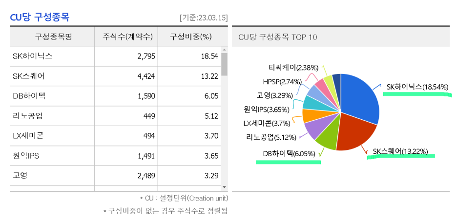 특이한점은 반도체 ETF하면 삼성전자가 들어갈것 같은데 없죠. 아무래도 삼성전자가 반도체 사업부만 있는것이 아니기때문에 오히려 ETF의 섹터성과를 제대로 반영하기 위해서는 ETF설계 단계에서 삼성전자가 없는게 더 좋을거라는 판단이 있었을 거라고 봅니다.