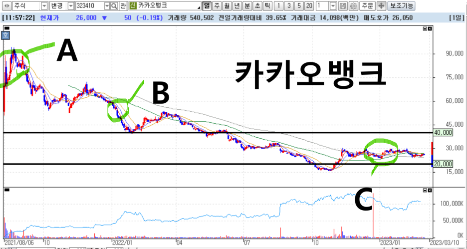 카카오뱅크 입니다. 대표적으로 전문가들이 입을 털만한 위치에서 A,B,C를 나누었는데요. 대부분 A부근에서는 산업의 동향에 대해서 조예가 깊은 사람들이 카카오뱅크를 많이 추천했을 거라고 봅니다. 은행의 혁신, 새로운 산업 등등 다양한 용어를 주식을 사고 싶겠끔 만들었을것 같은데요. 때문에 많은 개인투자자들이 저 부근에서 많은 매수를 하지 않았을까 합니다. 물론 그말이 잘못됬다고 절대 보지 않습니다. 언젠가는 그 전문가들이 말한 미래가 반드시 분명히 올거라고 봅니다. 하지만 그걸 받아드리는 투자자들은 지금당장이겠죠. 앞으로 10년후에나 그럴거라고 생각한다면 누가 투자하겠어요.
