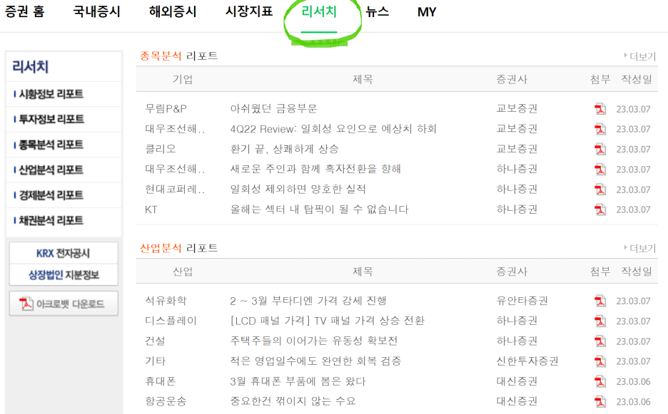 바로 직접적으로 들어가 보죠. 이런 기업실적 요인을 가장 손쉽게 알아낼수 있는 방법이 바로 증권보고서를 보는것인데, 예전에 각 증권사 사이트에 들어가서 봐야 무료로 볼수 있었는데 지금은 네이버 증권섹터에가면 각증권사별로 너무나도 잘 정리되어 있으니 공부하면 됩니다.