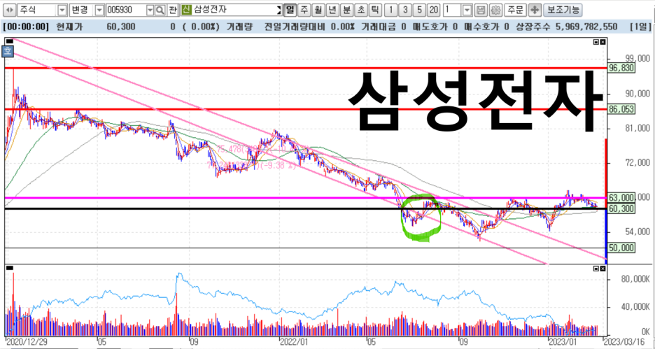 사실 역발상 투자를 삼성전자로 설명하기에 좀 그렇긴 하지만, 어짜피 원리는 같기 때문에 한번 봐요. 일단 삼성전자는 고점을 찍고 추세적으로 쭉하락하게 되는데요. 저기 형광펜으로 표시된 부분부터는 하락의 힘이 빠지게 됩니다. 작년에 삼성전자는 63000원 이하에서는 그냥 아무렇게나 사도 된다고 엄청 떠들었던 기억이 나는데요. 그당시엔 채팅방의 많은 사람들이 이해하지 못했을텐데 지내놓고 보면 무릎을 탁치게 되는거죠. 그런데 이말을 왜 꺼냈냐면 이런거죠.
