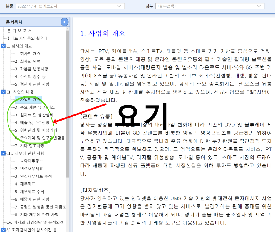 회사가 영위하는 사업에 대한 소개는 물론, 산업동향, 경쟁상황,위험요소, 생산설비, 수주상황등이 나와있죠.