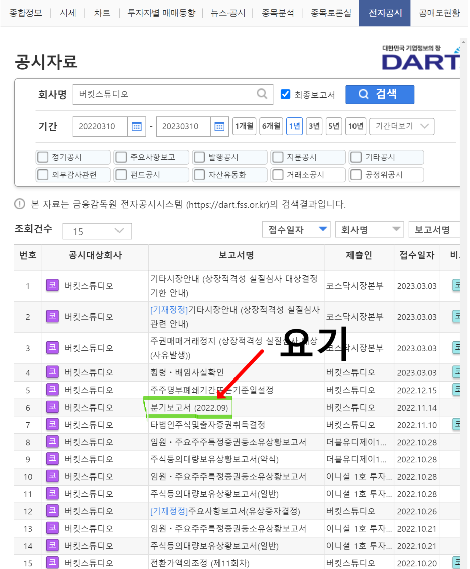 하지만 정작 전 특별한 상황이 아니면 다트에 잘 들어가보지 않게 되네요. 어짜피 종목을 알고 있으면 그냥 네이버 종목챕터에서 보는데요. 다들 아시겠지만 노파심에 우리 같이 봐요. 얼마전에 상담한 버킷스튜디오로 예시를 삼았어요. PC기준으로 전자공시 부분으로 들어가면 됩니다.