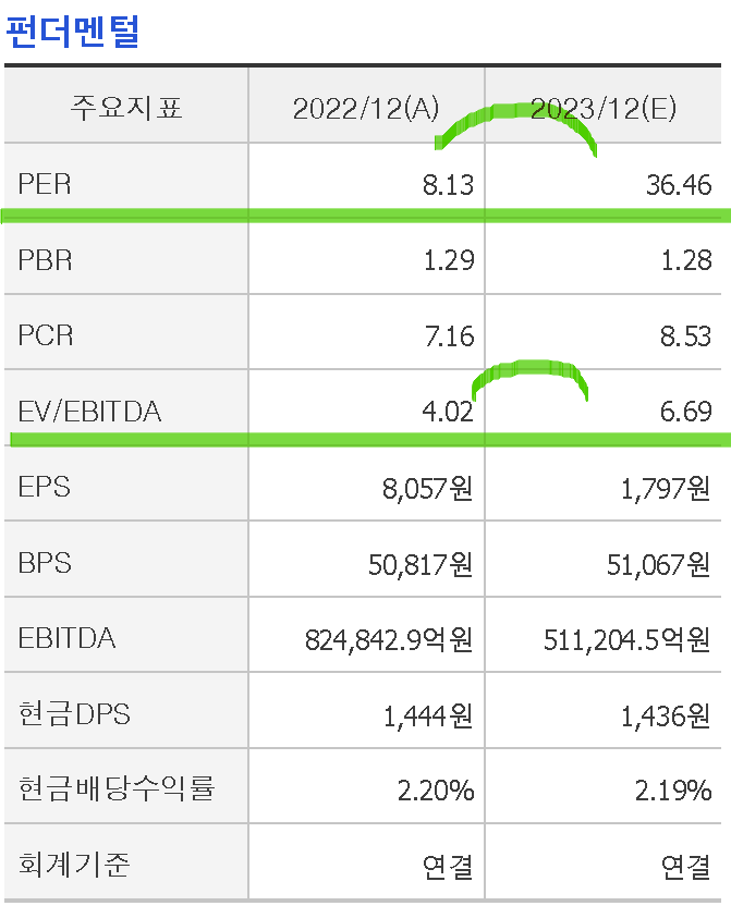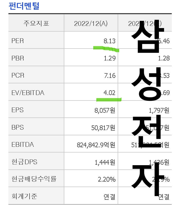 삼성전자가 사실상 어느정도 바닥을 잡았기 때문에 주가가 여기서 크게 하락하지는 않을거라고 봤을때, PER 지표는 4배 이상 뛰어 버립니다. 즉 시총이 크게 변할리는 없기 때문에 EPS가 크게 낮아 질거라는 거겠죠. 즉 앞서 말한 적자 가능성도 여기서 나오는 겁니다. 하지만 EV/EBITA는 PER에 비해면 크게 변하진 않습니다 .물론 저정도도 크게 변한게 맞지만 적어도PER에 비해서는 작죠. 이말은 기업의 가치에 큰 문제가 생기지 않는 다는 말이겠죠. 결국 우리나라 사람이 봤을땐 삼성전자가 적자가 나서 PER 30이 넘어가면 위기감을 느끼겠지만, 외국인들이 주로 보는 EV/EBITDA의 관점에서 봤을땐 오히려 이때가 기회다고 주가가 조금만 하락하면 매수가 들어 올거라고 예상할수 있죠.