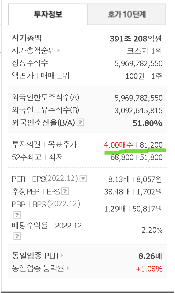 그렇다면, 네이버의 종목정보에 보면 목표주가 81,200원이라고 되어 있는데 어떤 의미인지 생각해 봐요. 현재 삼성전자의 주가가 65,500원일때 PER 8.13 라고 생각해 봤을때 81,200원은 약 PER 10정도라고 볼수 있습니다. 애널리스트가 굉장히 보수적이고 스탠다드 하네요. 이런점에서 볼때 우리나라의 최고의 가치를 가지는 삼성전자가 겨우 PER10으로 평가받는것도 아니고 목표주가가 PER10이라니 너무 아쉬울 따름이네요.