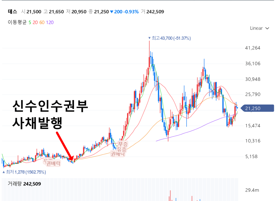 바로 테스가 재무적으로 탄탄한 회사였고 보유자금도 괜찮았는데, 신주인수권부사채 즉 CB를 발행한거죠. 사실상 유증이나 마찬가지 인데요. 당연히 이런 공시가 나오고 나서 주가는 폭락했습니다. 당시가 2013년 초였으니 관련차트를 봐요 깜짝 놀랄겁니다.