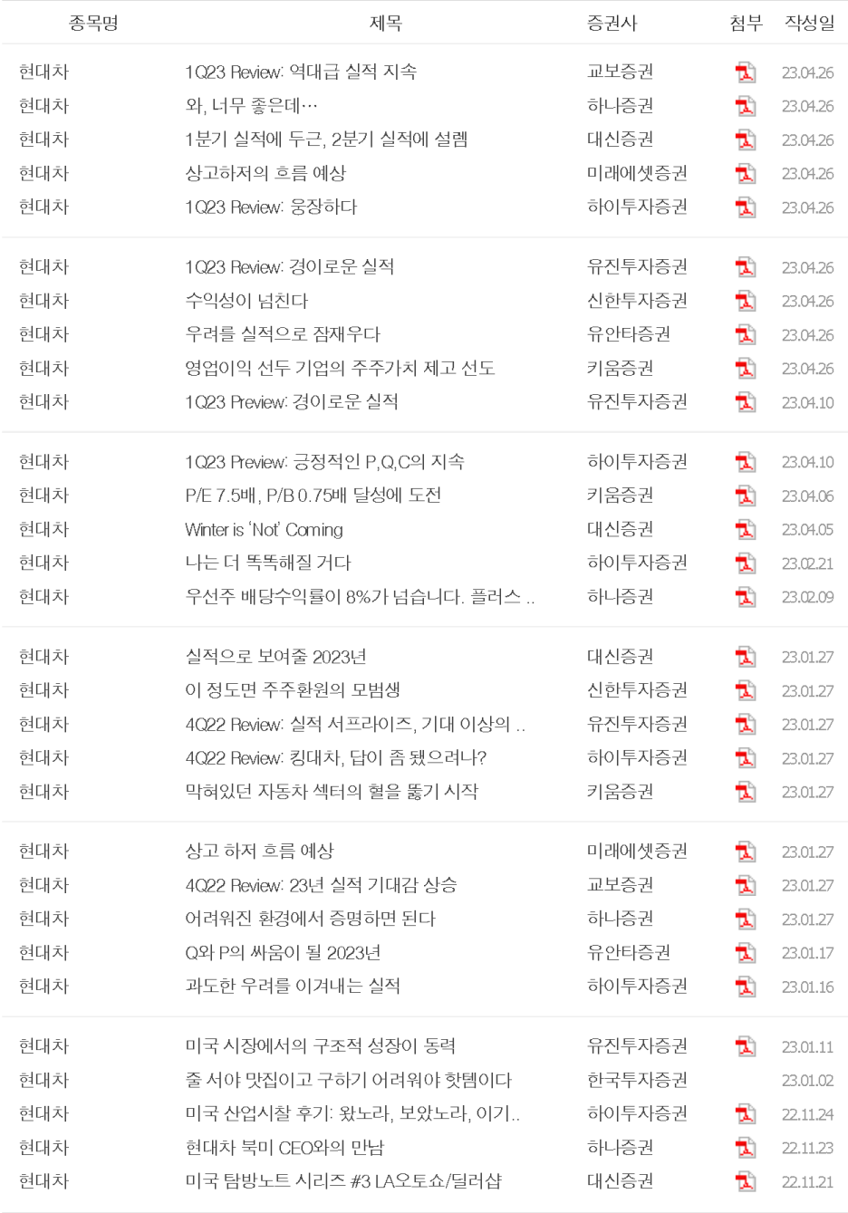 이렇게 거대한 회사의 매출액이 드라마틱하게 변하고 있는데요, 이런 변화에 대해서 애널리스트도 인지하고 목표가를 상향하기 시작했습니다. 현대차를 커버하고 있는 애널리스트들 보고서의 제목하고 업데이트 날짜만 볼까요?