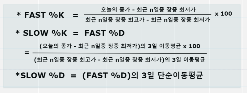스토캐스틱의 지표 값을 구하는 공식입니다. 사실 저걸 사람이 계산한다는 것은 너무 귀찮고 기계가 대신해 주는 겁니다. 하지만 공식만 어지러울 뿐이지 우리가 알아야 할 원리는 간단합니다.