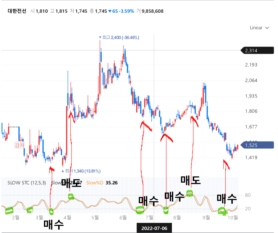 일단 대한전선의 네이버 차트의 슬로우 스토캐스틱을 추가해서 살펴봅시다.