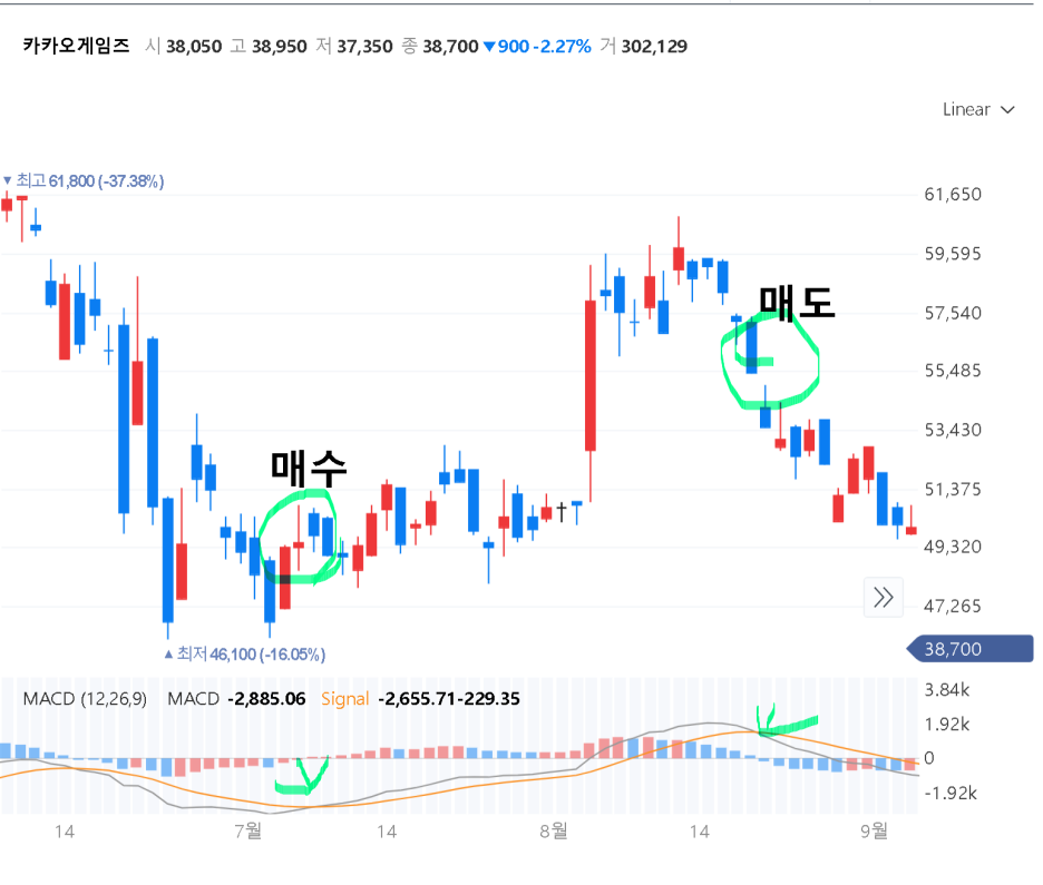 카카오 게임즈도 마찬가지 입니다. MACD시그널이 매수 신호를 줄때 매수하고 매도 신호를 줄때 매도하면 쉽게 매매를 할수 있고 수익도 얻을수 있습니다.