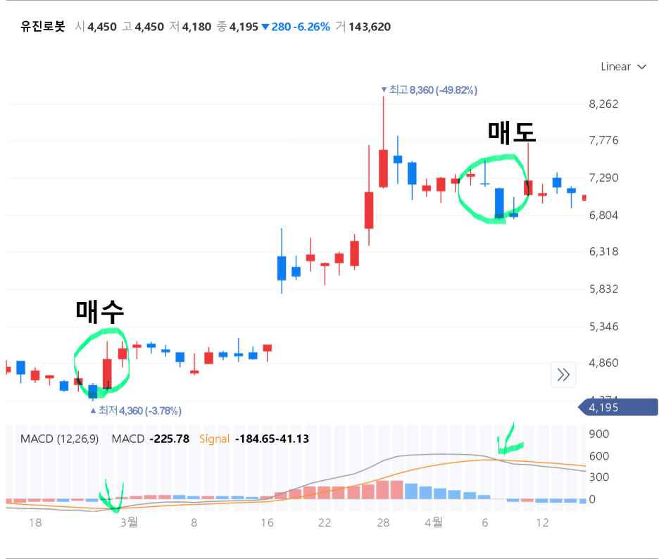 역시 우리 상담종목인 유진로봇 입니다. 장세가 좋아지는 시점에 MACD가 시그널을 주면 확률이 매우 높아지고 수익률도 커진다는 것을 알 수 있습니다.