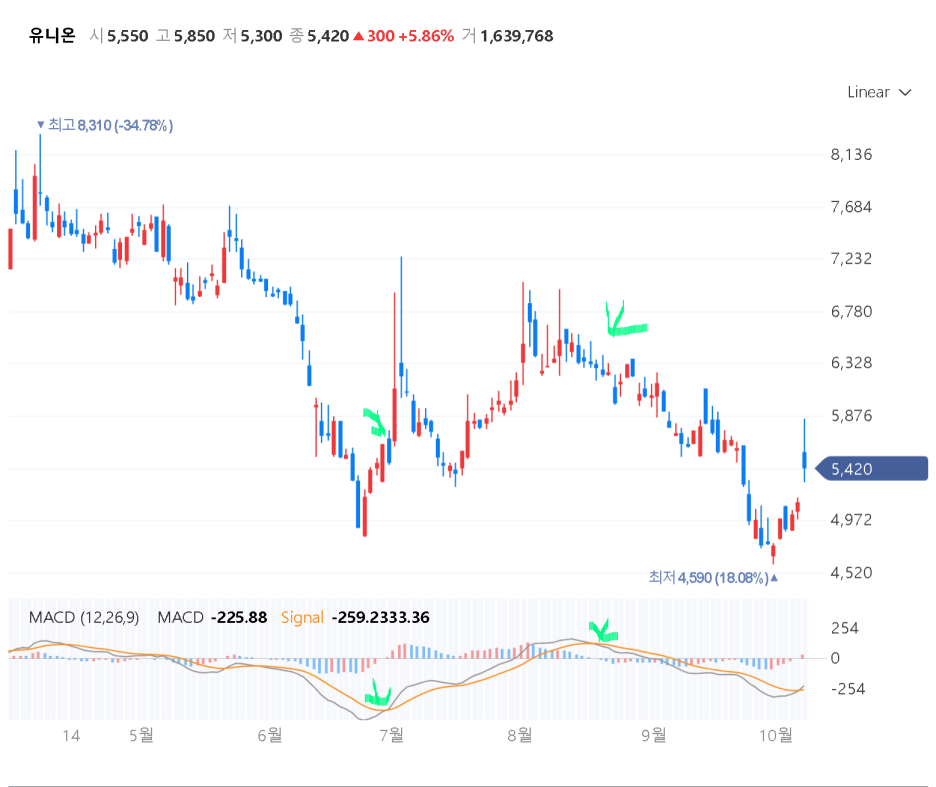 다음은 우리 상담 종목인 유니온인데 7월달에 녹색화살표로 표시된 부분이 있는데 그때가 바로 12일선이 26일선을 상향 돌파하는 시점 입니다. 그때 MACD시그널은 플러스를 만들면서 매수포인트를 알려 주고 있습니다. 반대로 8월 후반기에 녹색 화살표의 표시는 12일선이 26일선을 하향돌파 하게 되는데 그때 역시 MACD 시그널은 마이너스로 전환하면서 매도포인트를 알려 주고 있습니다. 이렇게 MACD의 이용방법은 너무 간단하고 쉽습니다. 더구나 추세지표이기 때문에 일단 방향만 잘 잡으면 쭉 끌고 갈 수 있다는 장점이 있기 때문에 단타보다는 스윙이나 중장기 투자에 투자자들이 많이 이용하는 편입니다. 몇개 더 보시죠.